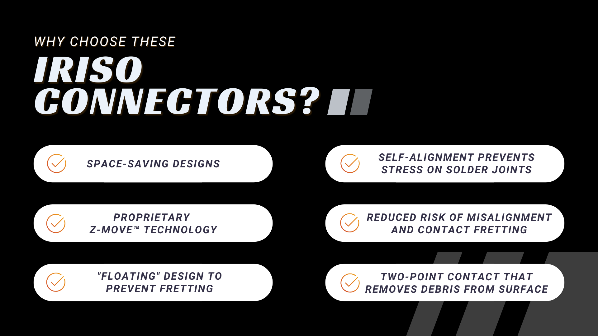 These connectors realize downsizing/low profile of equipment compared to traditional harness connections.Great for inverter, converter, eAxleIRISO’s proprietary Z-Move ™ technology uses the terminals’ spring feature and allows free movement