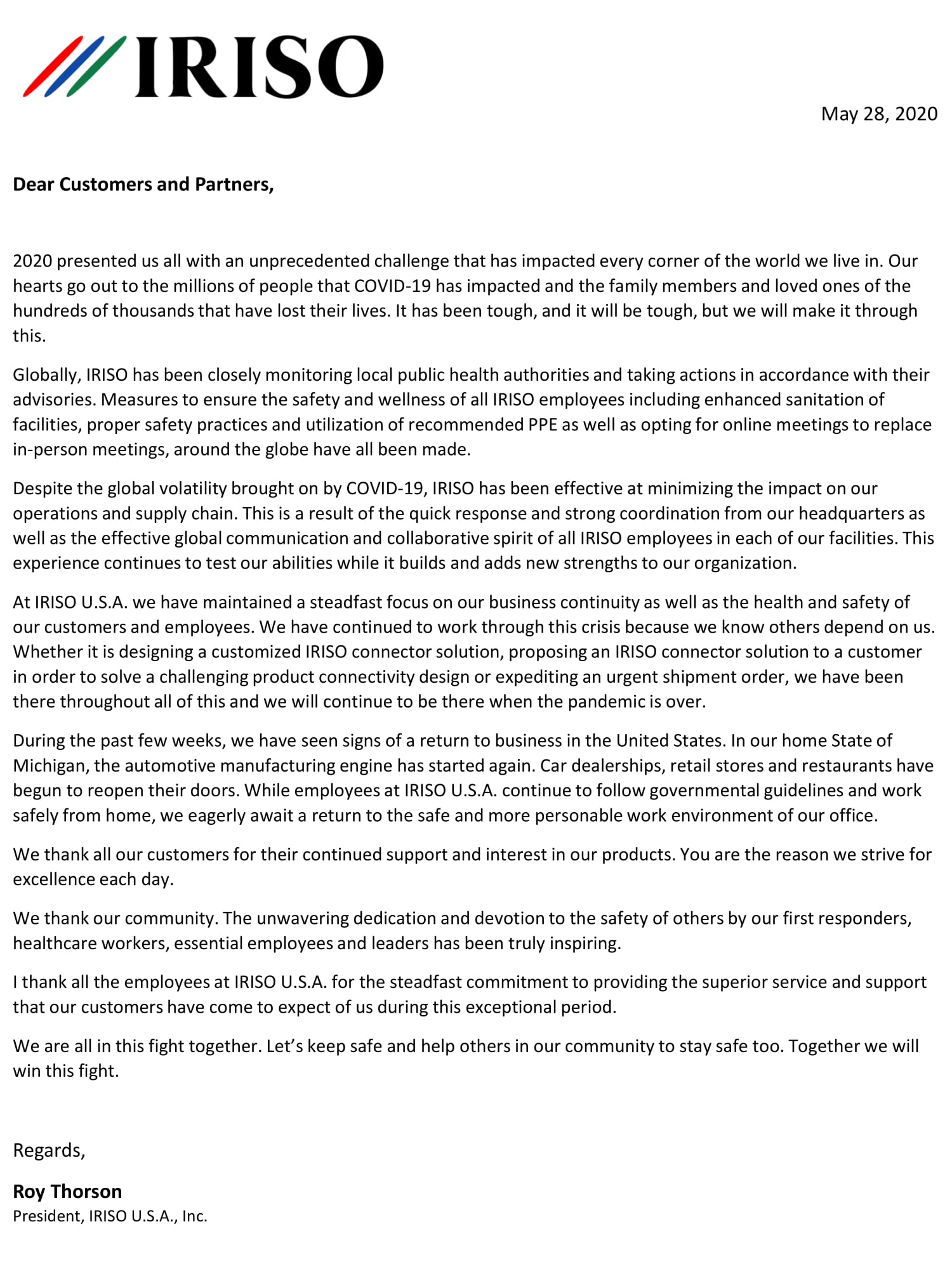 A Letter from IRISO U.S.A. President Roy Thorson --- May 2020