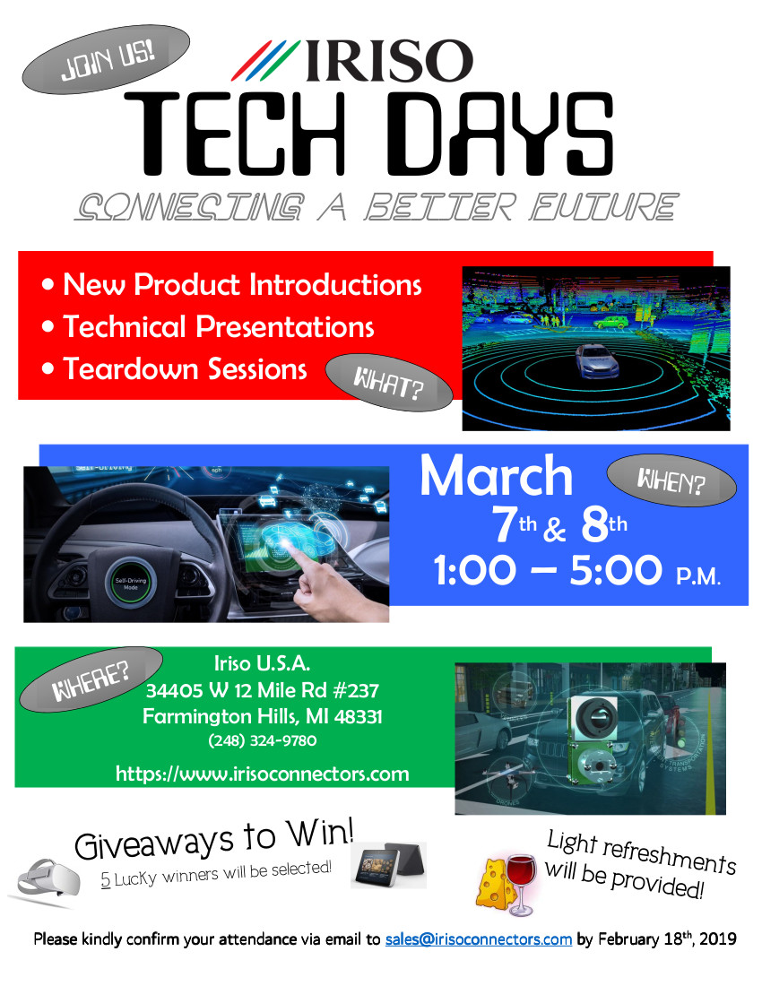 We hope you will join us for our Tech Days, March 7th – 8th, 2019. Come see our new product introductions, tech presentations and teardown sessions in our USA head office, Farmington Hills, Mi. Please kindly confirm your attendance via email to sales@irisoconnectors.com by February 18th, 2019