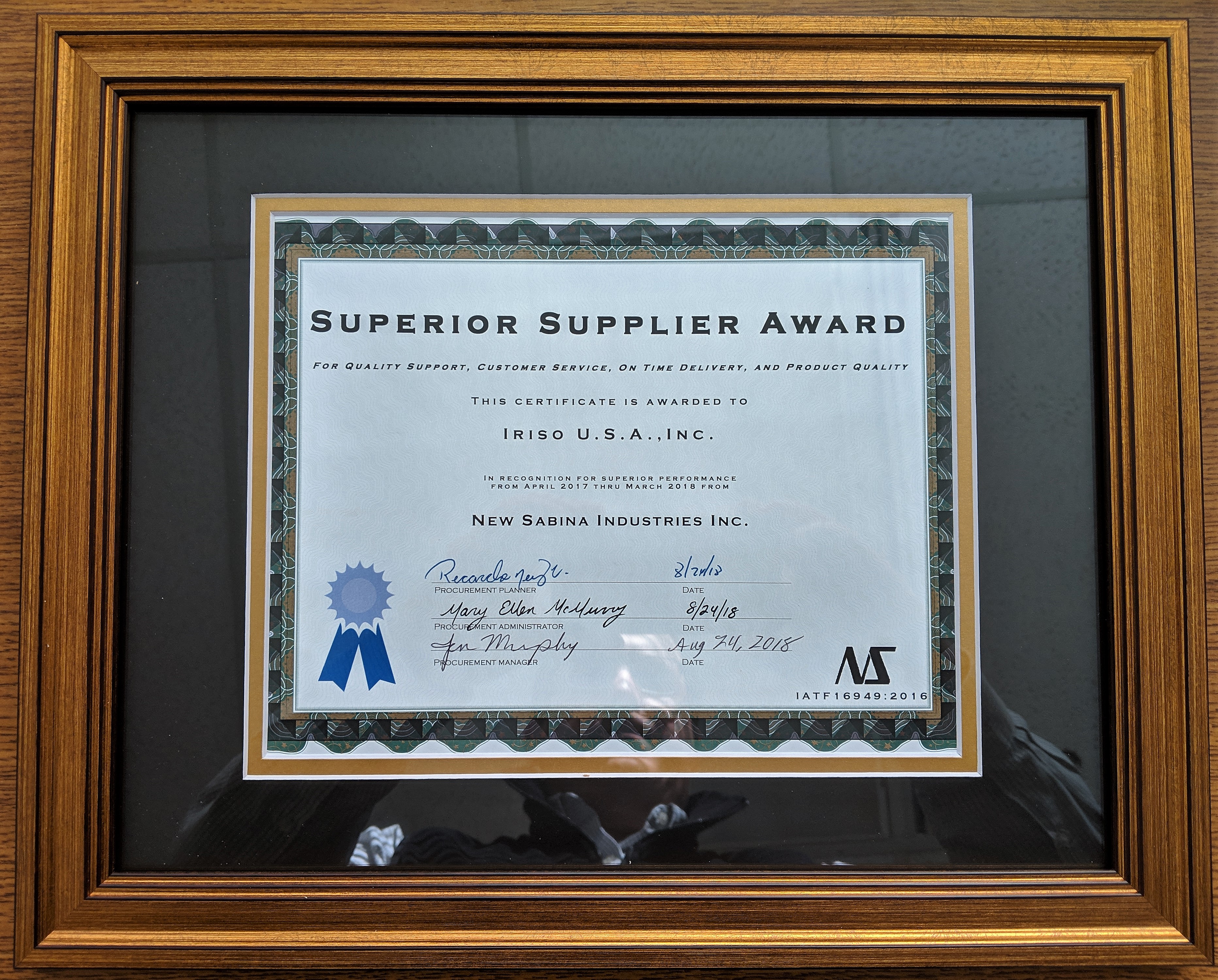 December 13th, 2018 at the NSI (Nippon Seiki International) supplier conference in Sabina, Ohio IRISO U.S.A. was awarded the “Superior Supplier Award”. This award recognizes IRISO U.S.A. for its quality support, customer service, on time delivery and product support from April 2017 to March 2018.