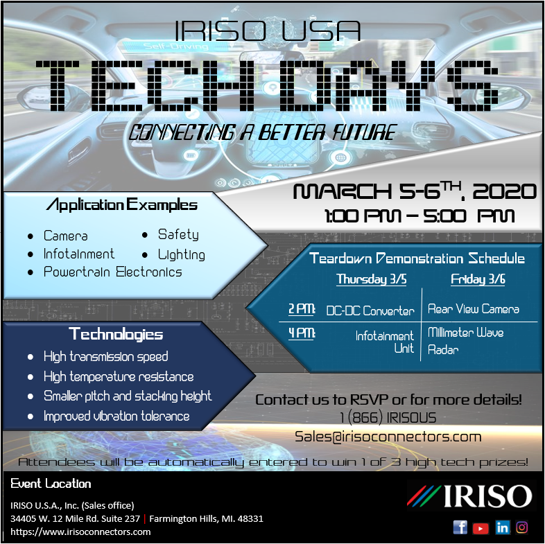 Tech Days is IRISO USA's open house event where you have the opportunity to view our showcased connector products.